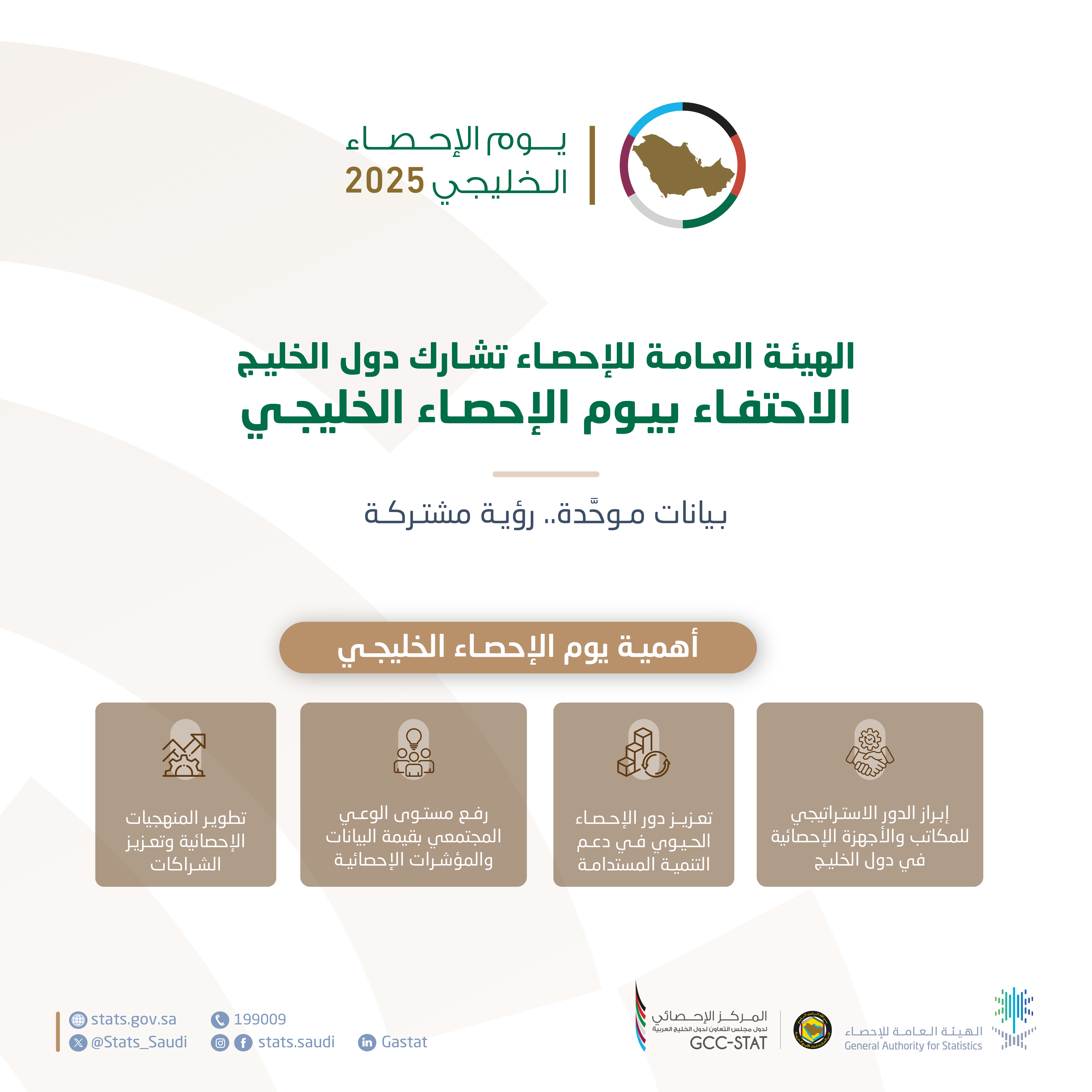 ويأتي الاحتفاء هذا العام استمرارًا لجهود دول المجلس في بناء منظومات بيانات إحصائية متقدمة تُسهم في توفير إحصاءات دقيقة وموحّدة، تعزّز فاعلية السياسات العامة وتدعم صناعة القرار، لمواكبة مستهدفات التنمية المستدامة. ويُعد يوم الإحصاء الخليجي مناسبة سنوية لإبراز أهمية القطاع الإحصائي ودوره المحوري في رسم ملامح المستقبل التنموي لدول المجلس، إلى جانب تعزيز وعي المجتمع بقيمة البيانات الإحصائية بوصفها عنصرًا رئيسًا في التطوير والنمو والتقدّم.