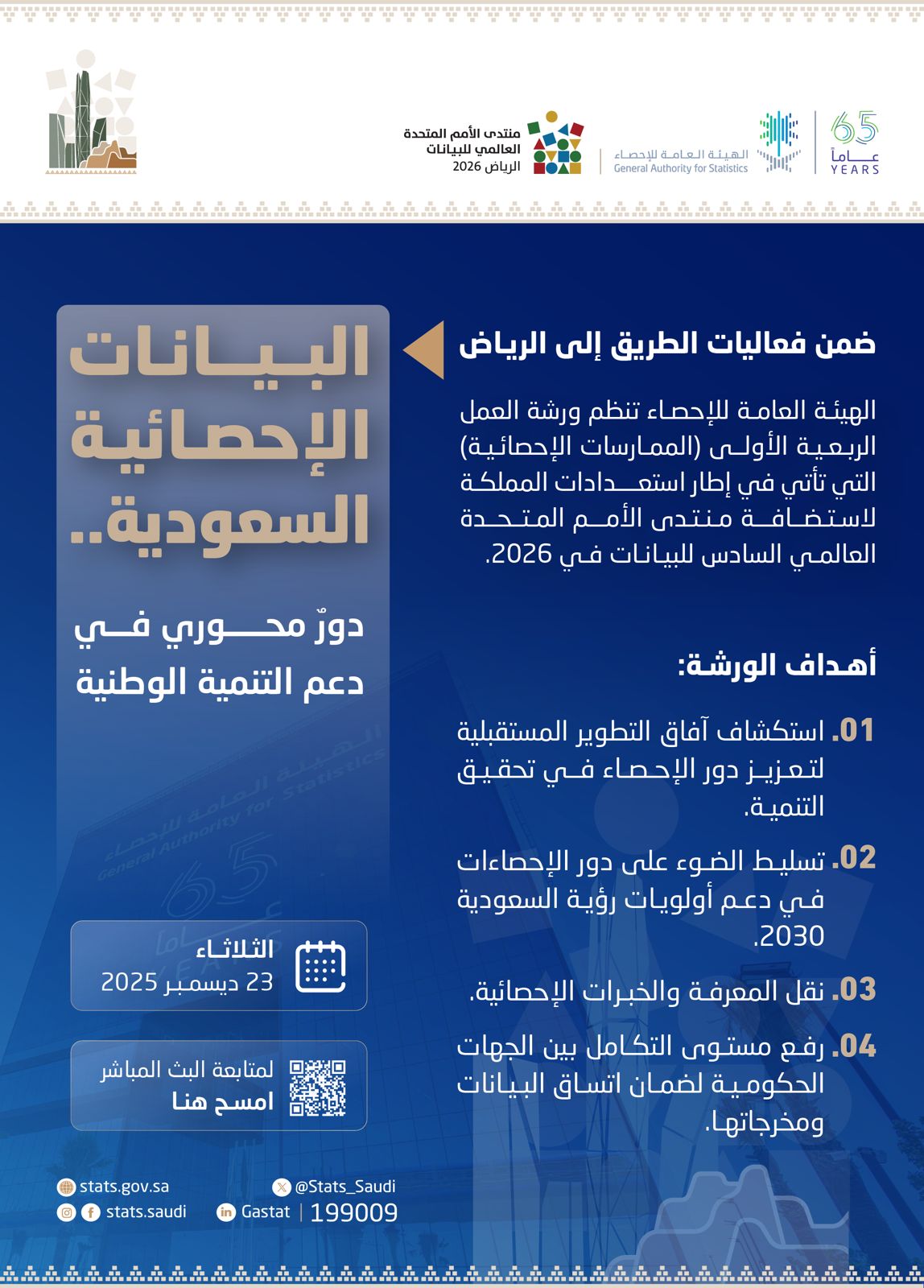 الجدير بالذكر أن الهيئة أطلقت هذه الفعاليات في إطار استعدادات المملكة لاستضافة منتدى الأمم المتحدة العالمي السادس للبيانات في 2026 ، لإبراز ما تشهده المملكة من تطور إحصائي وتحول رقمي شامل في مجال البيانات الإحصائية، حيث تستمر هذه الفعاليات حتى إقامة المنتدى السعودي الثاني للإحصاء خلال الثامن من نوفمبر، قبل عقد المنتدى خلال الفترة 9-12 نوفمبر 2026.