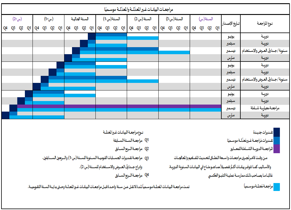 2. المراجعة الدورية: هي المراجعات التي تُجرى مع كل إصدار جديد للبيانات، وعادةً ما تكون لأحدث الفترات السابقة. بالنسبة لتقديرات الحسابات القومية ربع سنوية، فإن هذه المراجعات تكون عمومًا مراجعات أقل من سنوية لفترات تقع ضمن نفس العام أو العام السابق.