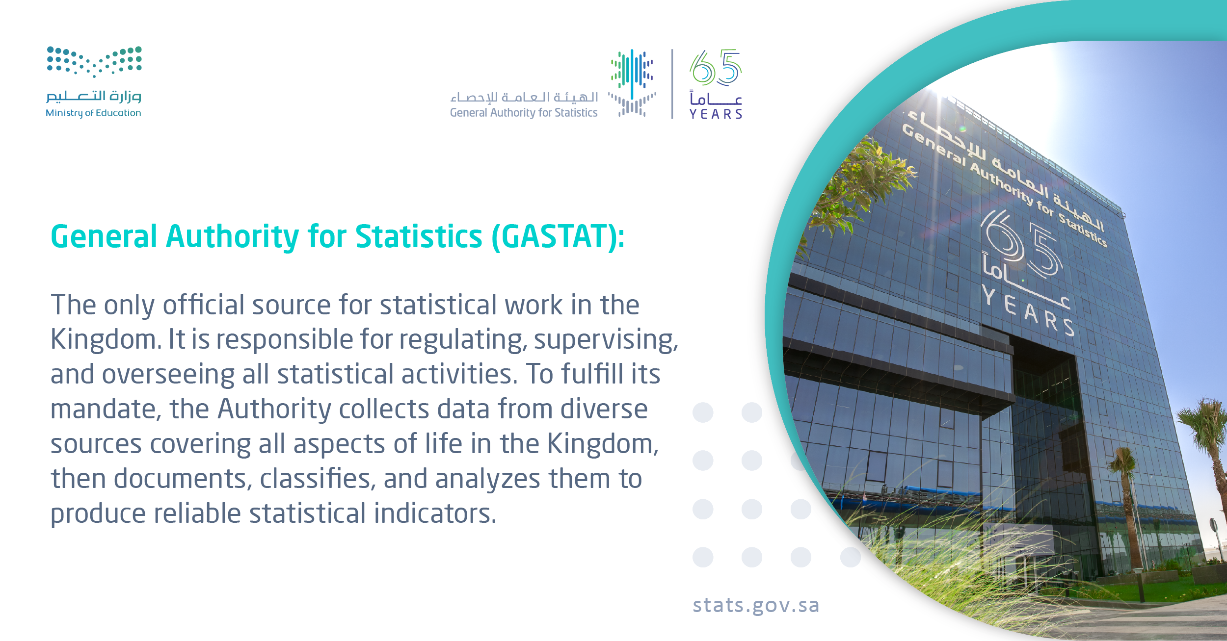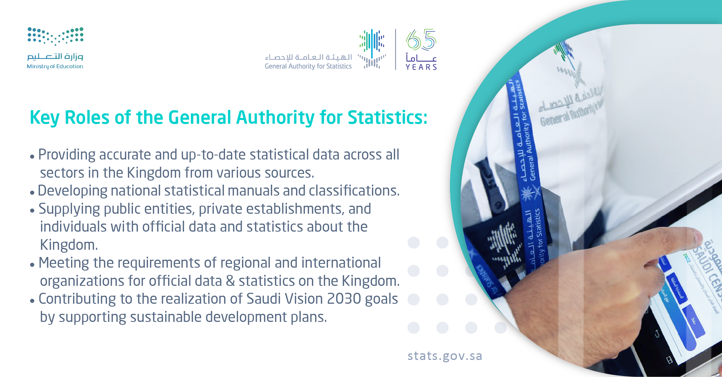 The General Authority for statistics is the only official statistical reference for implementing, supervising, and regulating the statistical work in the Kingdom of Saudi Arabia. It collects data and information covering various aspects of life in the Kingdom from multiple sources. Additionally, it develops statistical guides and classifications and supplies official statistics to public entities, the private sector, individuals, and international organizations. It also works to enhance statistical awareness to foster community involvement in statistical activities.