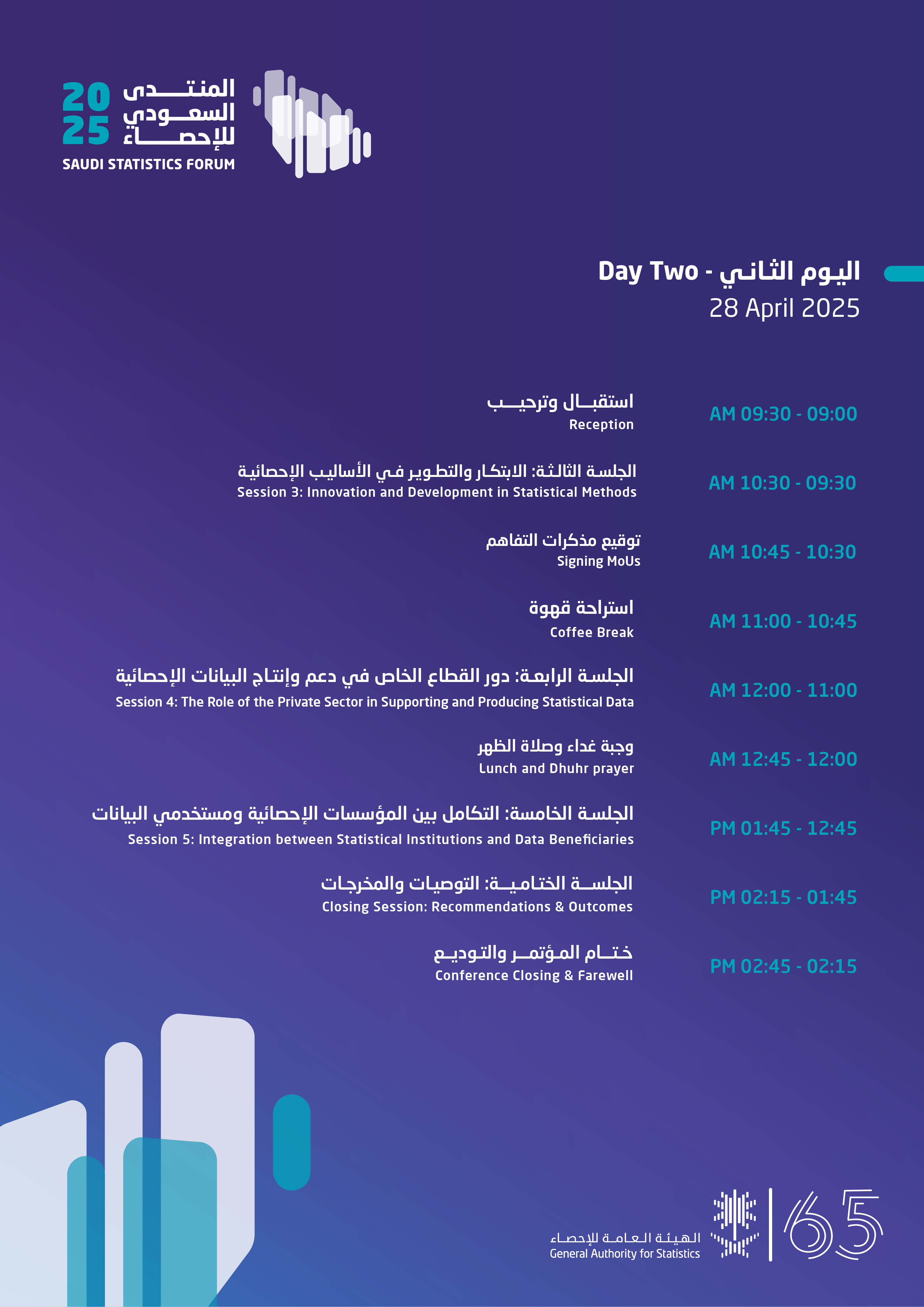 It is the first Saudi Statistics Forum. It will be held on April 27 - 28, 2025, in Riyadh, under the patronage of the Minister of Economy and Planning, Chairman of GASTAT Board of Directors. The forum will be attended by several esteemed officials, experts, and specialists. It aims to discuss important topics in the field of statistics, highlight the positive impact of the statistics sector in supporting the journey of renaissance and sustainable development in the Kingdom, measure progress in the indicators of Saudi Vision 2030, and emphasize the importance of data and statistics in raising awareness among society members .