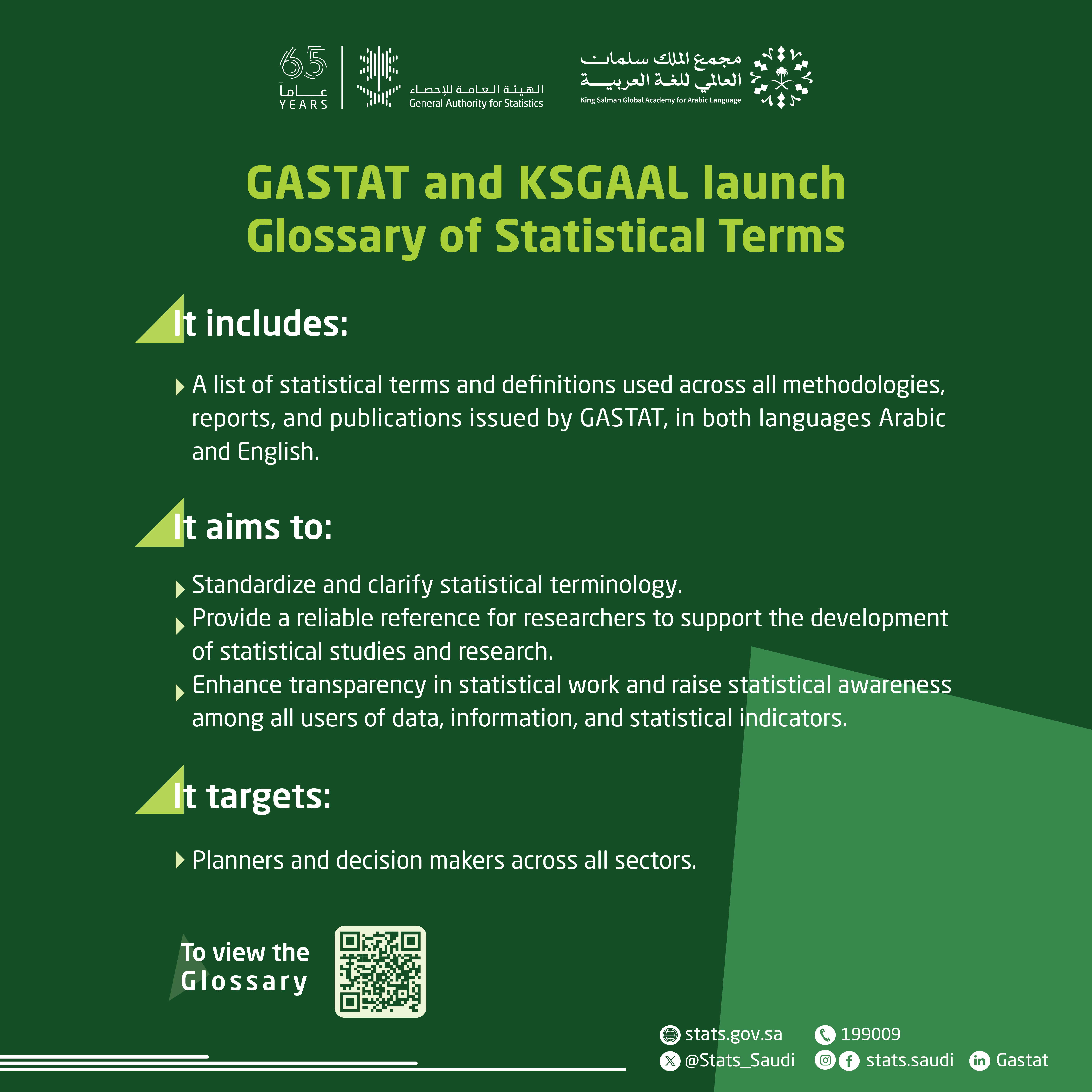 King Salman Global Academy for the Arabic Language ) KSGAAL(, in collaboration with the General Authority for Statistics (GASTAT), has launched the Glossary of Statistical Terms. The goal of this strategic step is standardizing statistical concepts, providing a reliable reference for researchers, decision-makers, and media outlets, and offering a specialized tool that supports transparency and enhances statistical awareness among data and indicator users.