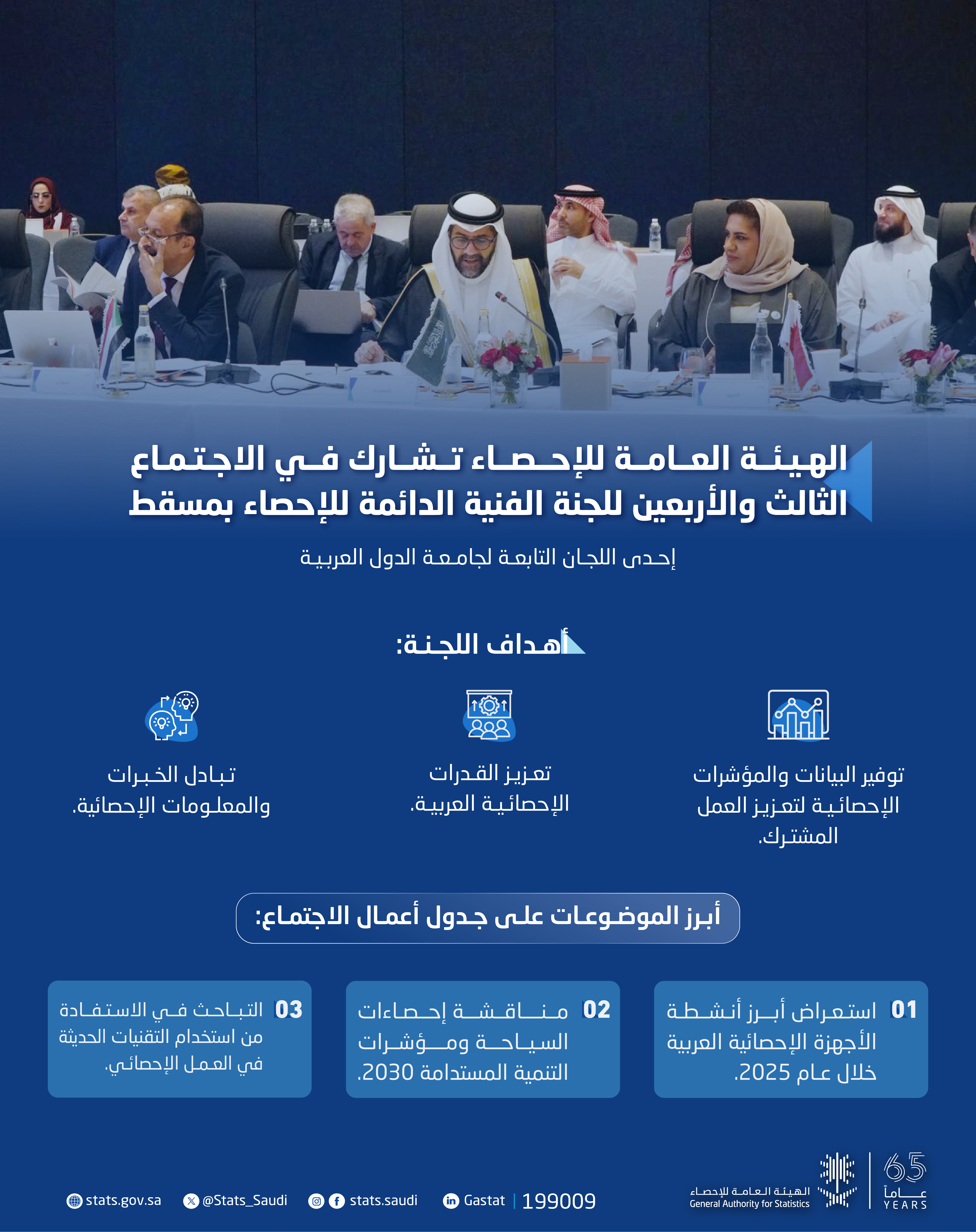 الهيئة العامة للإحصاء تشارك في الاجتماع الثالث والأربعين للجنة الفنية الدائمة للإحصاء بمسقط