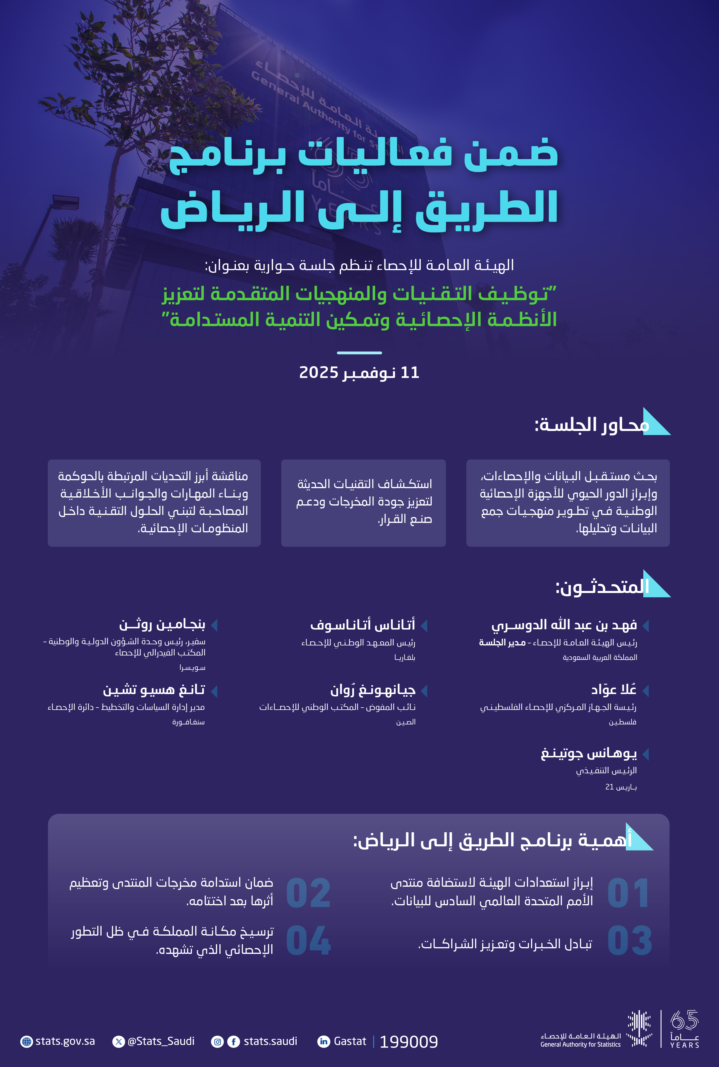 تطلق الهيئة العامة للإحصاء أولى فعاليات برنامج الطريق إلى الرياض الذي سيمتد على مدار عام كامل قبل استضافة منتدى الأمم المتحدة العالمي السادس للبيانات في الرياض خلال شهر نوفمبر 2026، ويتضمن سلسلة من ورش العمل والجلسات الحوارية على المستويات المحلية والإقليمية والدولية، بمشاركة نخبة من الخبراء والمؤسسات الإحصائية من مختلف دول العالم، حيث ستعقد جلسة حوارية بعنوان: "توظيف التقنيات والمنهجيات المتقدمة لتعزيز الأنظمة الإحصائية وتمكين التنمية المستدامة " على هامش أعمال الاجتماع الـ40 للمجموعة رفيعة المستوى للشراكة والتنسيق وبناء القدرات في مجال الإحصاءات لأجندة التنمية المستدامة 2030 (HLG-PCCB) التابعة للأمم المتحدة، الذي تستضيفه المملكة العربية السعودية في مقر الهيئة وذلك خلال يومي 10 و11 نوفمبر 2025، والتي تُسهم في تعزيز التعاون الدولي وتطوير الأنظمة الإحصائية الوطنية والدولية وبناء شراكات بين المكاتب الإحصائية الوطنية والمنظمات الدولية والقطاع الخاص والمجتمع المدني لتطوير نظم البيانات والإحصاءات على مستوى العالم، إلى جانب الإشراف على تنظيم المنتدى.