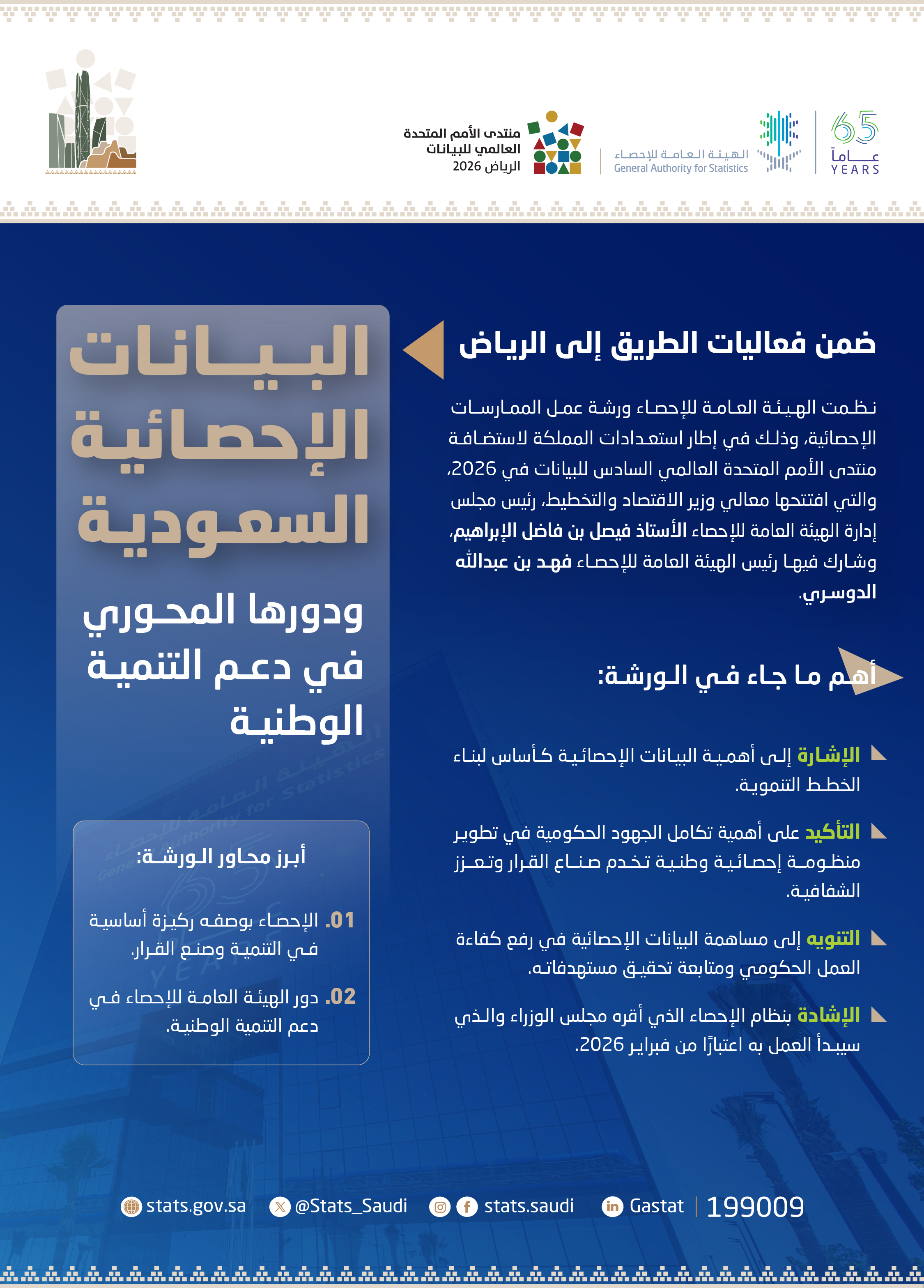 تجدر الإشارة إلى أن هذه الورشة تأتي ضمن سلسلة من الجهود المستمرة التي تنفذها الهيئة العامة للإحصاء في إطار الطريق إلى الرياض، والتأكيد على جاهزية المملكة لاستضافة منتدى الأمم المتحدة العالمي للبيانات 2026 وتعزيز مكانتها الريادية في تطوير العمل الإحصائي على المستويين الإقليمي والدولي.